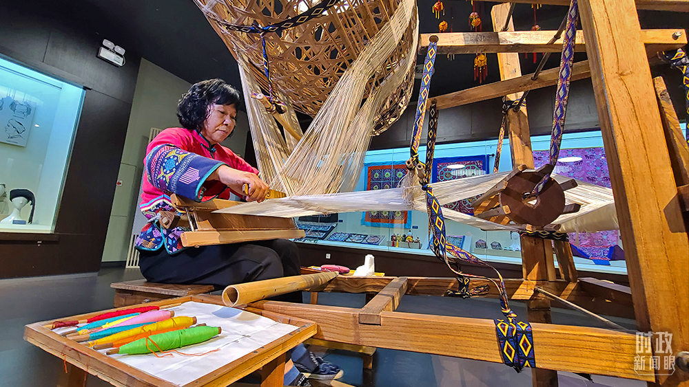 △壮锦是国家级非遗,以结实耐用、图案别致著称。66岁的谭湘光是广西壮锦技艺传承人。(总台央视记者赵化拍摄)