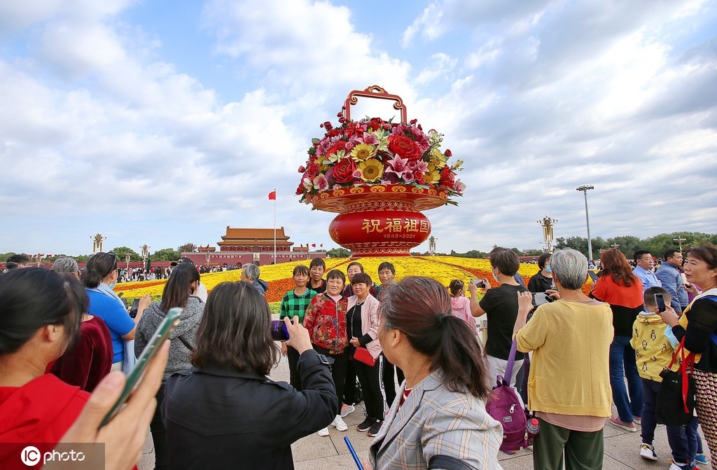 2021年10月1日,北京,今天是国庆节也是国庆假期首日,天安门广场人山人海、游客如潮,迎来旅游客流高峰。当日,北京秋高气爽、气温舒适宜人。