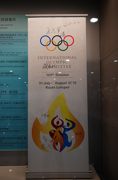 步入第六展区,一张海报让人很难错过。海报上,英文“国际奥委会第128次全会”“吉隆坡”的字眼,让熟悉冬奥的人立马可以辨认出,这是国际奥委会第128次全会的易拉宝宣传海报。海报上的签名来自当时申冬奥代表团部分工作人员,其中,就包括陈述人之一、时任北京冬奥申委副主席、中国残奥委员会主席张海迪。历经岁月洗礼,上面的字迹已经有些淡去,承载的珍贵记忆却依旧闪亮。