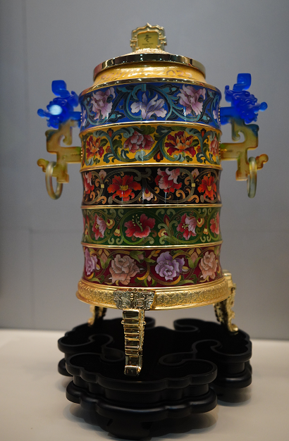 一件高43厘米的珐琅尊以其明亮的色彩、别致的造型吸引不少观众的驻足,这是北京冬奥会特许纪念商品“冬奥五环珐琅尊”。特许商品一经问世就引发了全民的收藏热潮,供不应求,市面较少见到;因此,这件展品也成了该展区的一大驻足点。