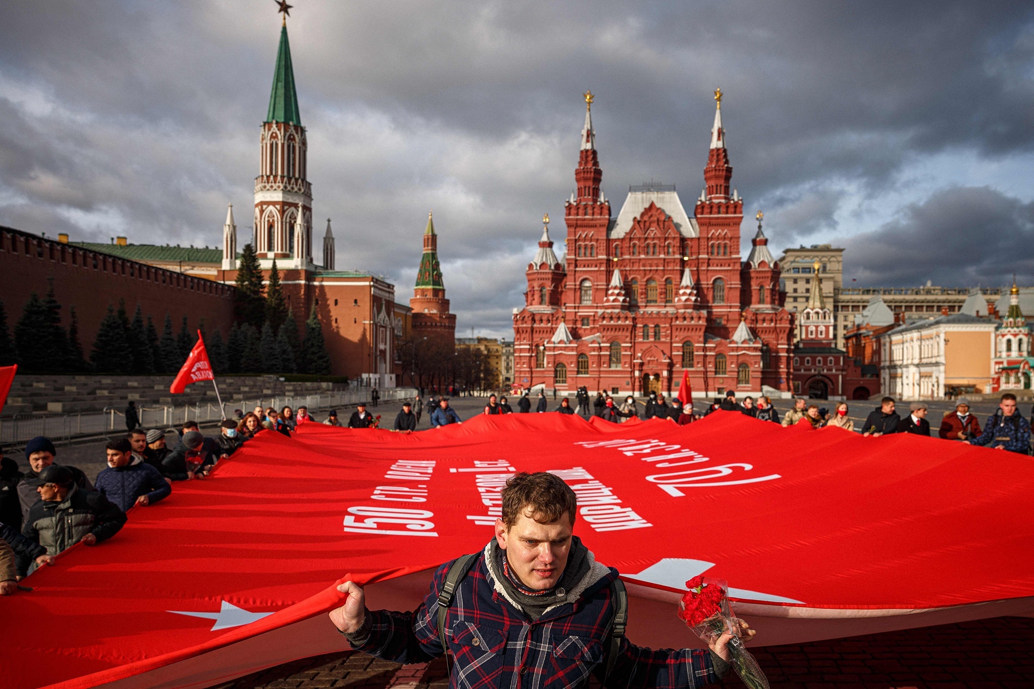 当地时间2021年11月7日,俄罗斯莫斯科,俄罗斯民众在莫斯科红场游行,纪念十月革命104周年。