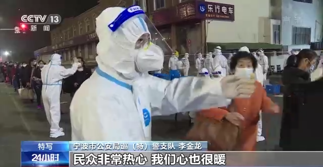 宁波市公安局巡(特)警支队 李金龙:我感觉宁波这个城市还是挺温暖的,特别是晚上的时候给我们送包子,包括送方便送矿泉水,民众非常热心,我们心也很暖。 不管是政府或者是民众来说,大家积极配合,包括医护人员,包括我们的社区工作者,广大群众大家都是一样齐心协力。