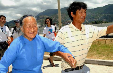 2003年7月22日,在马祖探亲的福建省连江县83岁的张水金老人(左)和儿子(右)乘坐“闽珠二号”海上直航客轮回到福州马尾。新华社记者 张国俊 摄