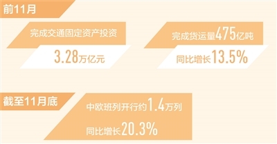 记者从近日召开的全国交通运输工作会议获悉:今年前11月,我国完成交通固定资产投资3.28万亿元;预计全年新改(扩)建高速公路超过9000公里、新改建农村公路超过16万公里、新增城市轨道交通运营里程超过1000公里、新增及改善高等级航道约1000公里、新颁证民用运输机场9个。