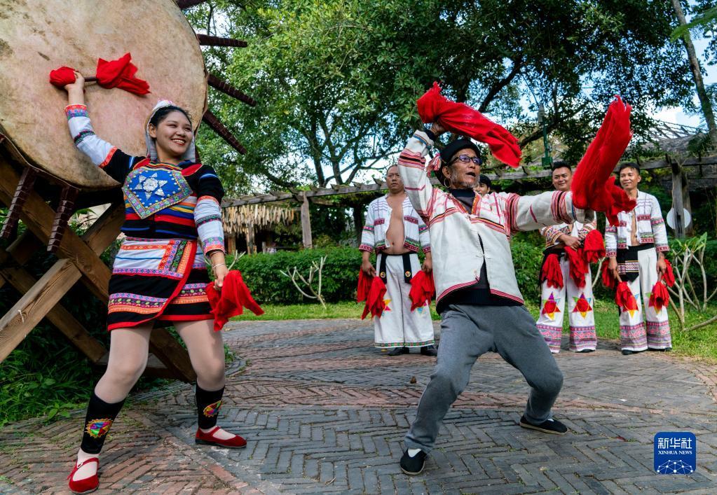 在不远处的旅游景区基诺山寨,游客聚在大鼓前和当地群众共舞,古老的民族文化被激发出无限的生命力。