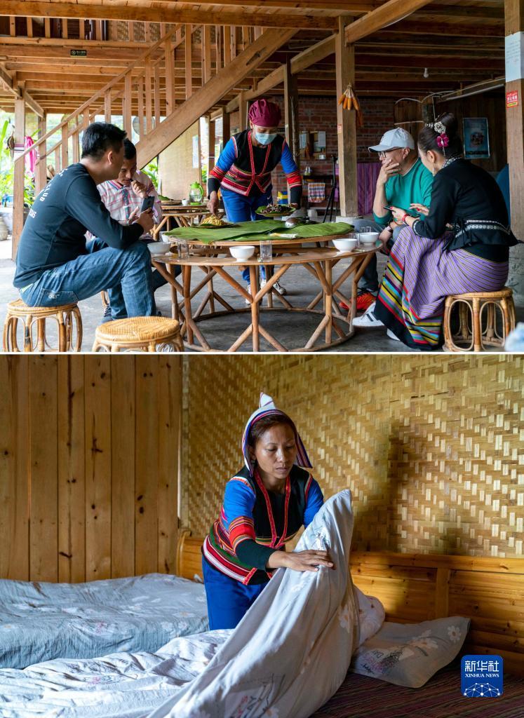 拼版图片:上图为基诺族村民姿梅(中)在自家开办的农家乐里为游客端上基诺族美食(12月12日摄);下图为基诺族村民姿梅在自家开办的民宿里整理床铺(12月12日摄)。新华社记者 陈欣波 摄