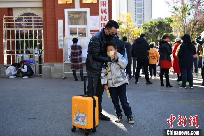 中新网昆明1月7日电 (陈静)7日上午11时,在位于昆明市呈贡区的四川师范大学附属昆明实验学校门口,二年级的范同学拉着行李箱冲出校门,和两周没见的爸爸紧紧拥抱。情绪平复后他告诉记者,“我不害怕,老师说有很多医护人员在保护我们,疫情总会过去的。”