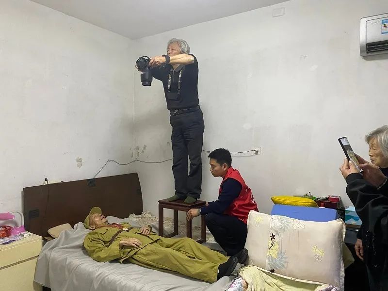 在跟进拍摄过程时,一张“花絮照” 让人泪目。照片中,一张板凳放在床上, 摄影师何荣发站在上面,旁边的志愿者帮忙扶着凳子 。而何荣发的镜头正下方,是身着军装躺在床上的老兵王泉元。