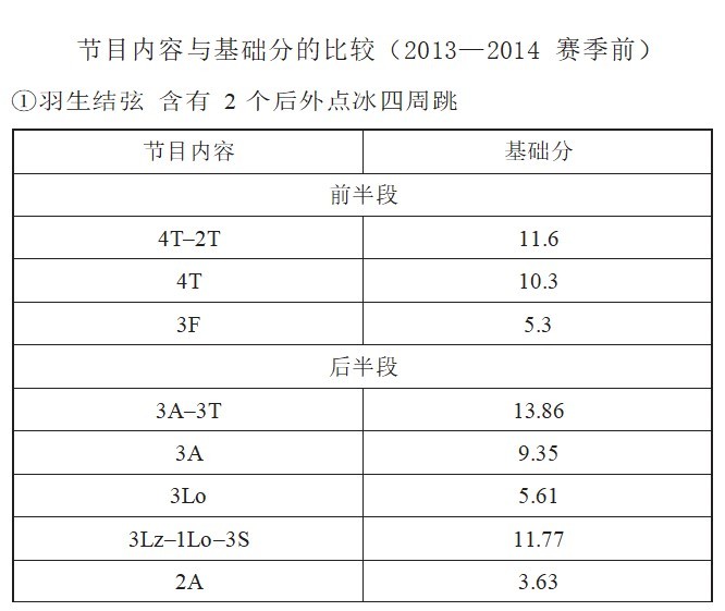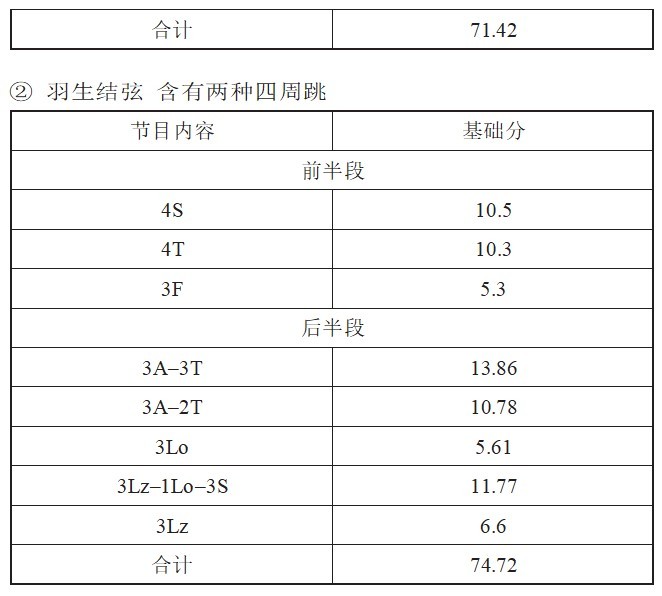 如果在节目里采用2个后外点冰四周跳,那么无论什么样的高分组合,因为只有一个阿克塞尔三周跳,所以基础分仅为71.42分。但是,如果采用两个不同种类的四周跳,基础分就变成了74.72分。因此,主动出击很重要。