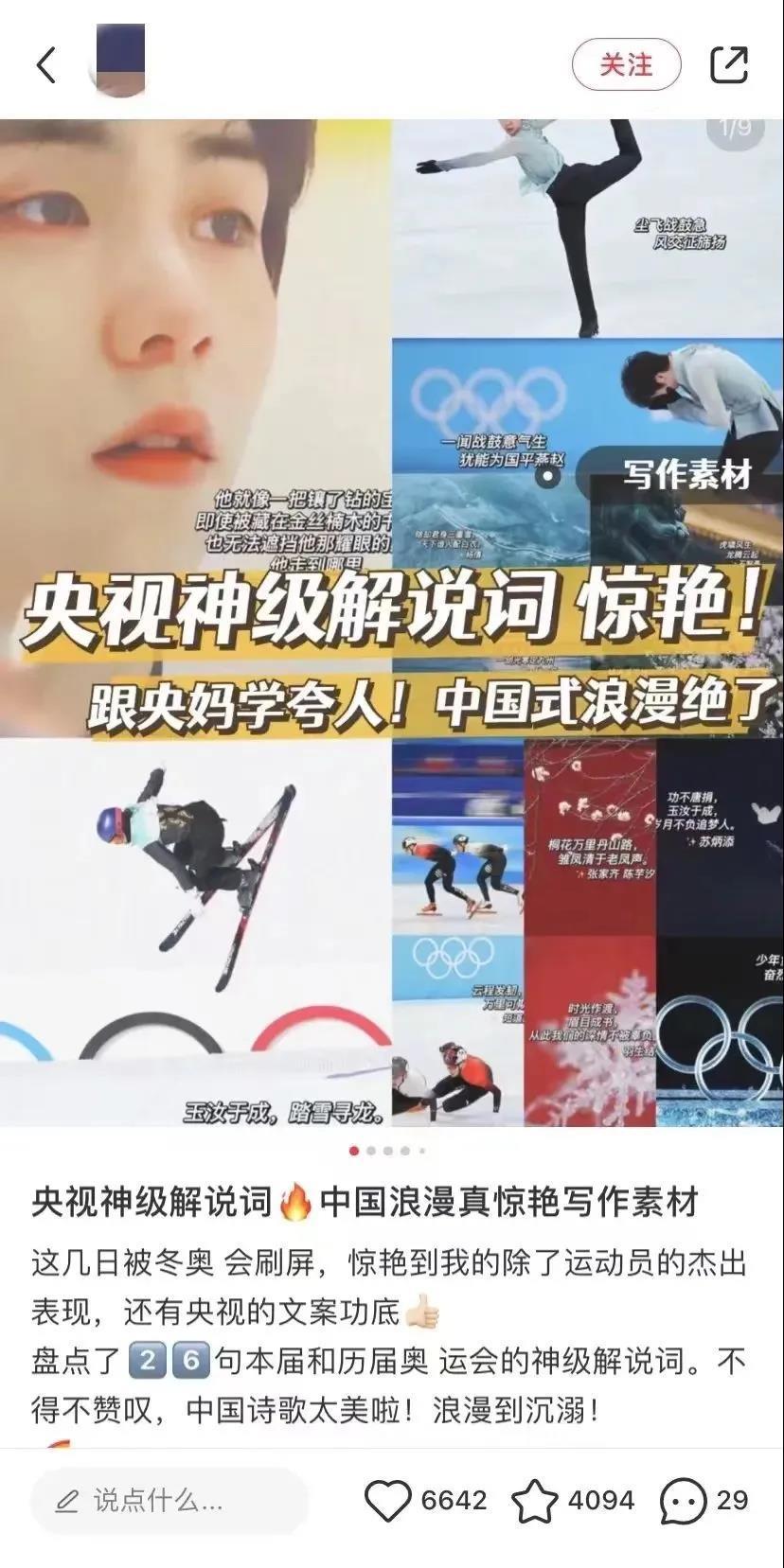 有网友说,“冬奥赛场上,你可以永远相信奋勇拼搏的运动员,也可以永远相信央视的神级解说!堪称大型作文素材输出现场!”花式摘抄,也是广大网友的传统艺能了: