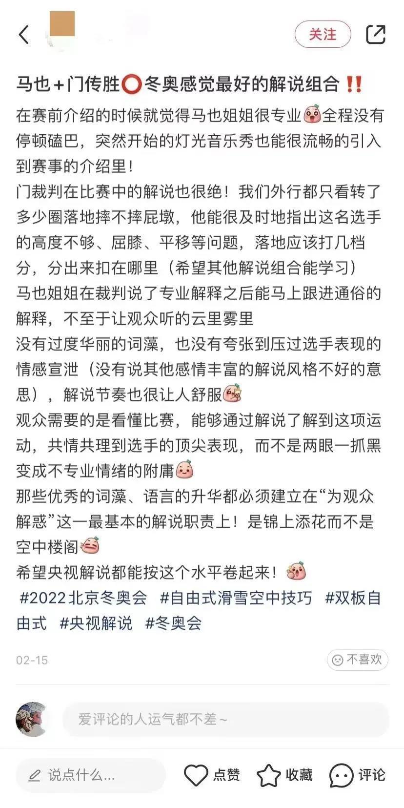 高亭宇赢得北京冬奥会速度滑冰男子500米“飞人大战”。总台解说嘉宾、索契冬奥会速度滑冰女子1000米冠军张虹在解说中难掩激动。赛后她说“我可能不是最完美的解说”,网友却纷纷表白“没有您的专业解说,我其实不懂这项运动的规则;没有您的呐喊,我大概不会热泪盈眶”。