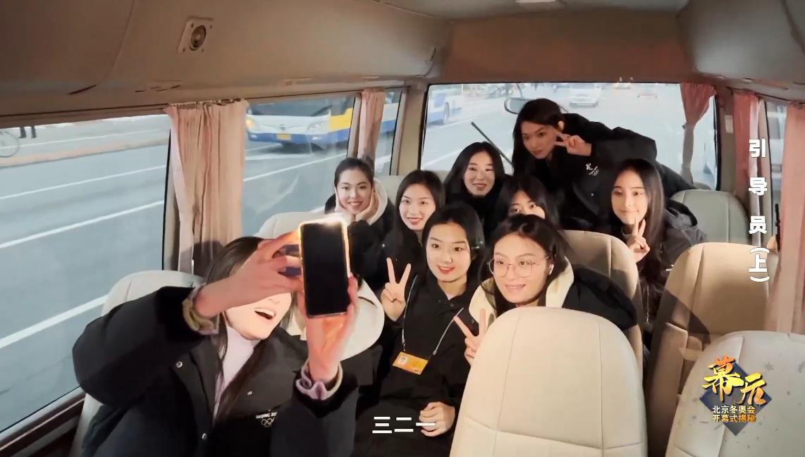 在122名引导员当中,北京服装学院的学生最多,共21人,她们大多数来自服装表演专业,无论是身高还是步态,她们的整体实力要高于其他高校的学生。集训一个月之后,总导演张艺谋需要看一下引导员的服装和引导牌的舞台效果,导演组就从她们当中选派了19人第一次走进了鸟巢。候场区和舞台之间隔着一道中国门,这道门开启前,引导员们对即将看到的一切还一无所知。
