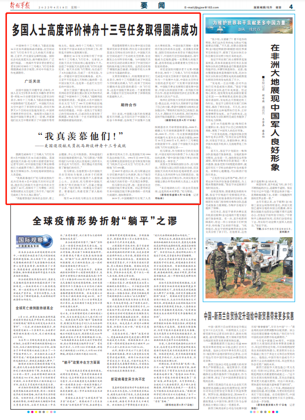 中国神舟十三号载人飞船返回舱16日在东风着陆场成功着陆,在空间站执行飞行任务半年之久的航天员翟志刚、王亚平、叶光富安全顺利出舱。国际社会对此高度关注,海外媒体及时、广泛进行报道。一些海外专家学者在接受记者采访时对神舟十三号载人飞行任务取得圆满成功表示祝贺,并对中外航天合作充满期待。
