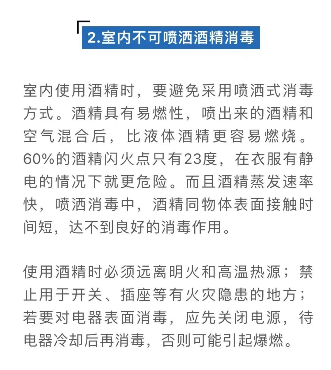 近日,上海辟谣平台澄清数条“家里喷酒精消毒,使用不当导致火灾”的传言。虽然相关事件的起火原因与喷洒酒精无关,但使用酒精、消毒液时确实要当心,不合理的消毒方式不仅起不到杀灭病毒的作用,反而可能会对身体或环境造成伤害。