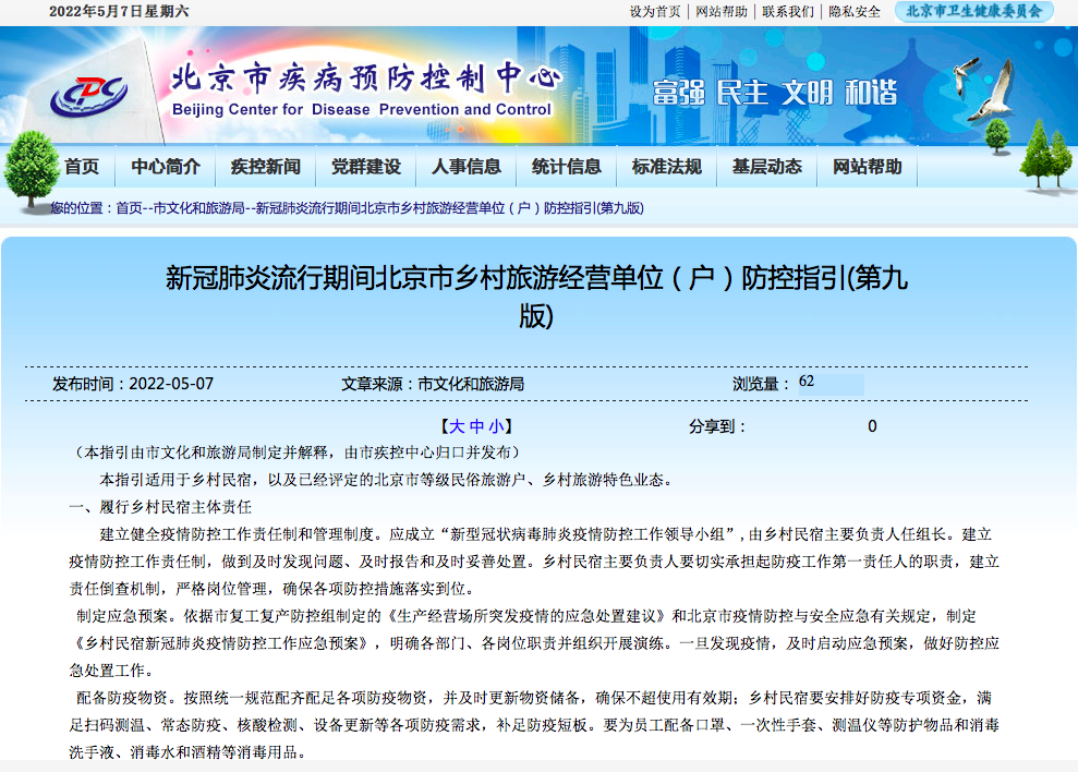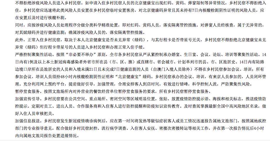 5月7日,北京市疾病预防控制中心在官方网站上发布了《新冠肺炎流行期间北京市乡村旅游经营单位(户)防控指引(第九版)》,明确规定乡村民宿不得拒绝涉疫风险人员进入。“如申请入住乡村民宿人员的北京健康宝出现红码、黄码、弹窗限制等异常情况,乡村民宿不得拒绝入住,乡村民宿应迅速将此类风险人员安置在乡村民宿临时安置客房,对北京健康码异常且其未持有7日内核酸检测阴性证明的风险人员,应在安置后及时进行核酸补测。”
