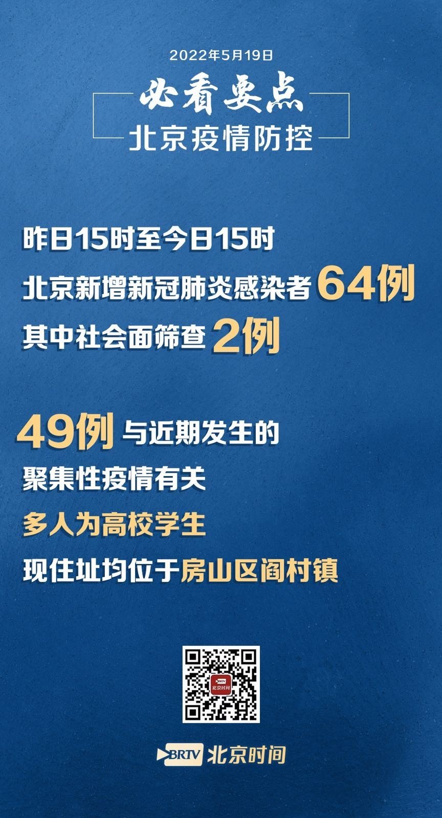 北京市疫情防控第339场新闻发布会强调,当前北京市接连出现几起聚集性疫情,首都疫情仍处于胶着状态,社会面仍可能存在隐匿传播风险,还远不到松劲懈怠的时候。新增本土新冠肺炎病毒感染者64例,其中49例与近期发生的聚集性疫情有关。北京理工大学房山分校聚集性疫情已累计确诊11例,已对良乡大学城5所高校执行更严格的全封闭管理,严格执行非必要不出校。提示高校、养老机构、福利院、农贸批发市场、工地等人员密集场所仍是疫情防控的重中之重。