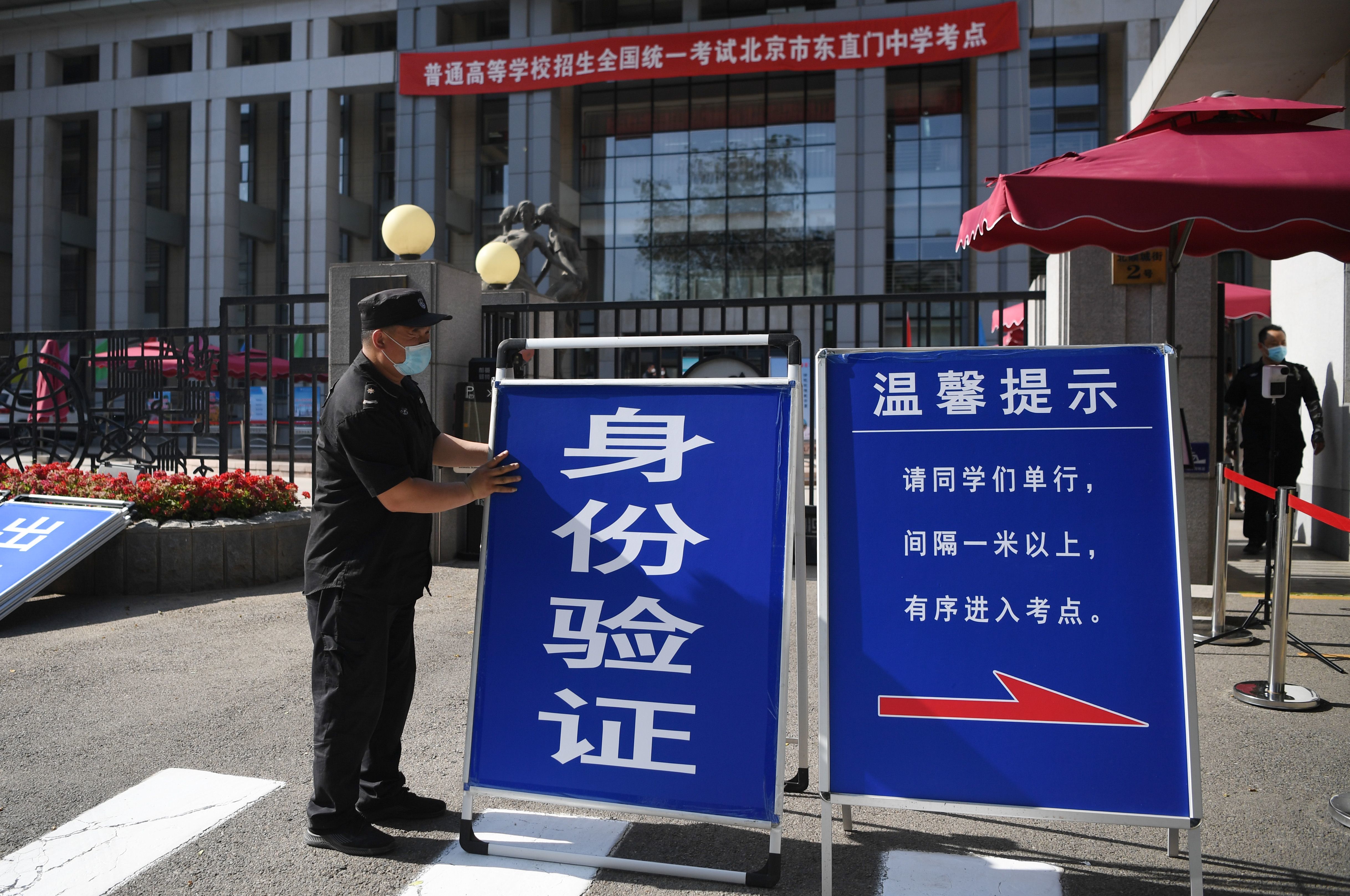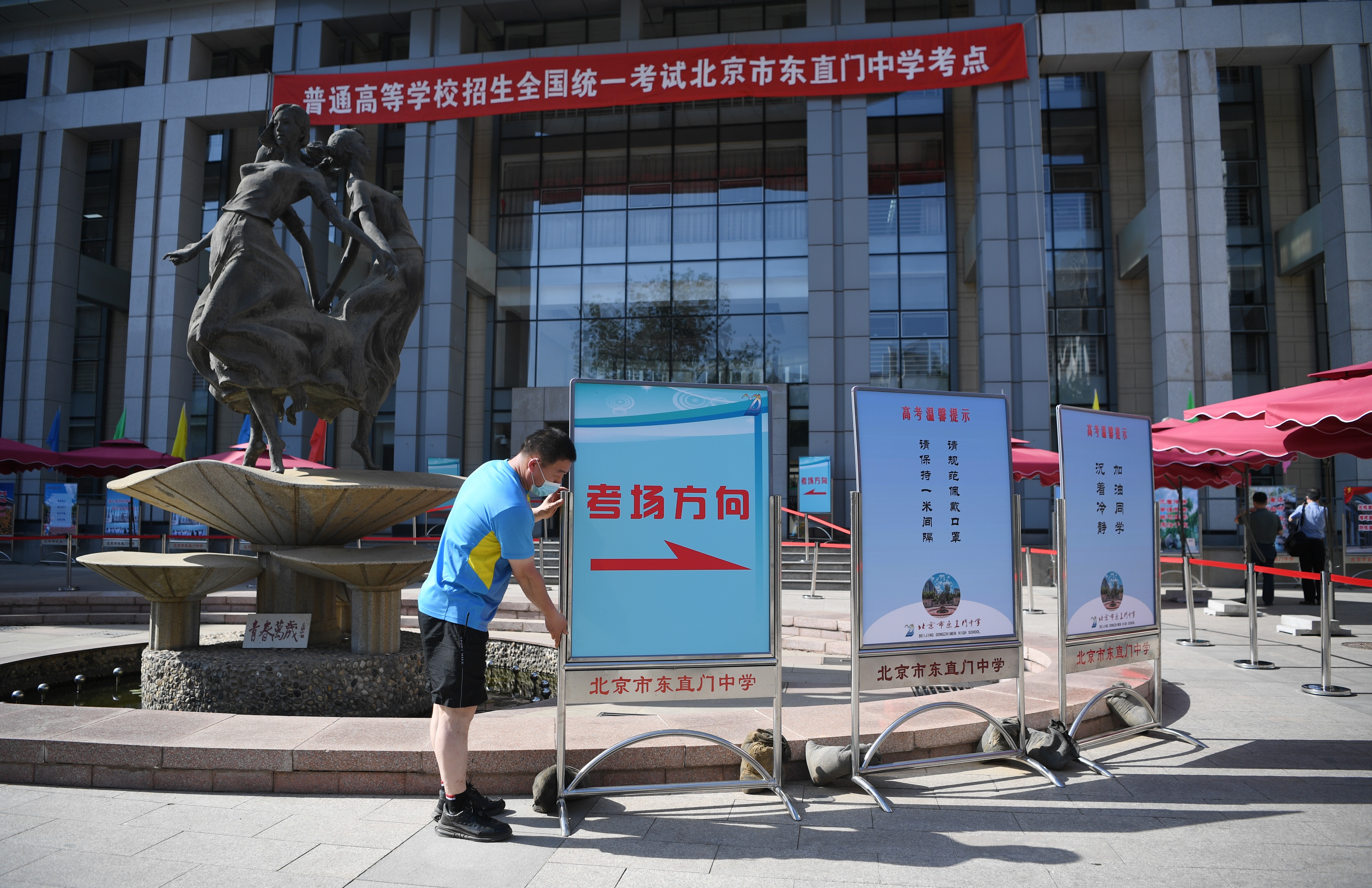 6月1日,东直门中学考点,工作人员摆放标识牌。东直门中学校长熊劲介绍,考场均设置在该校东教学楼,其中备用考场在一层,正常考场在二三四层,“出于疫情防控需要,所有考生不走回头路。”