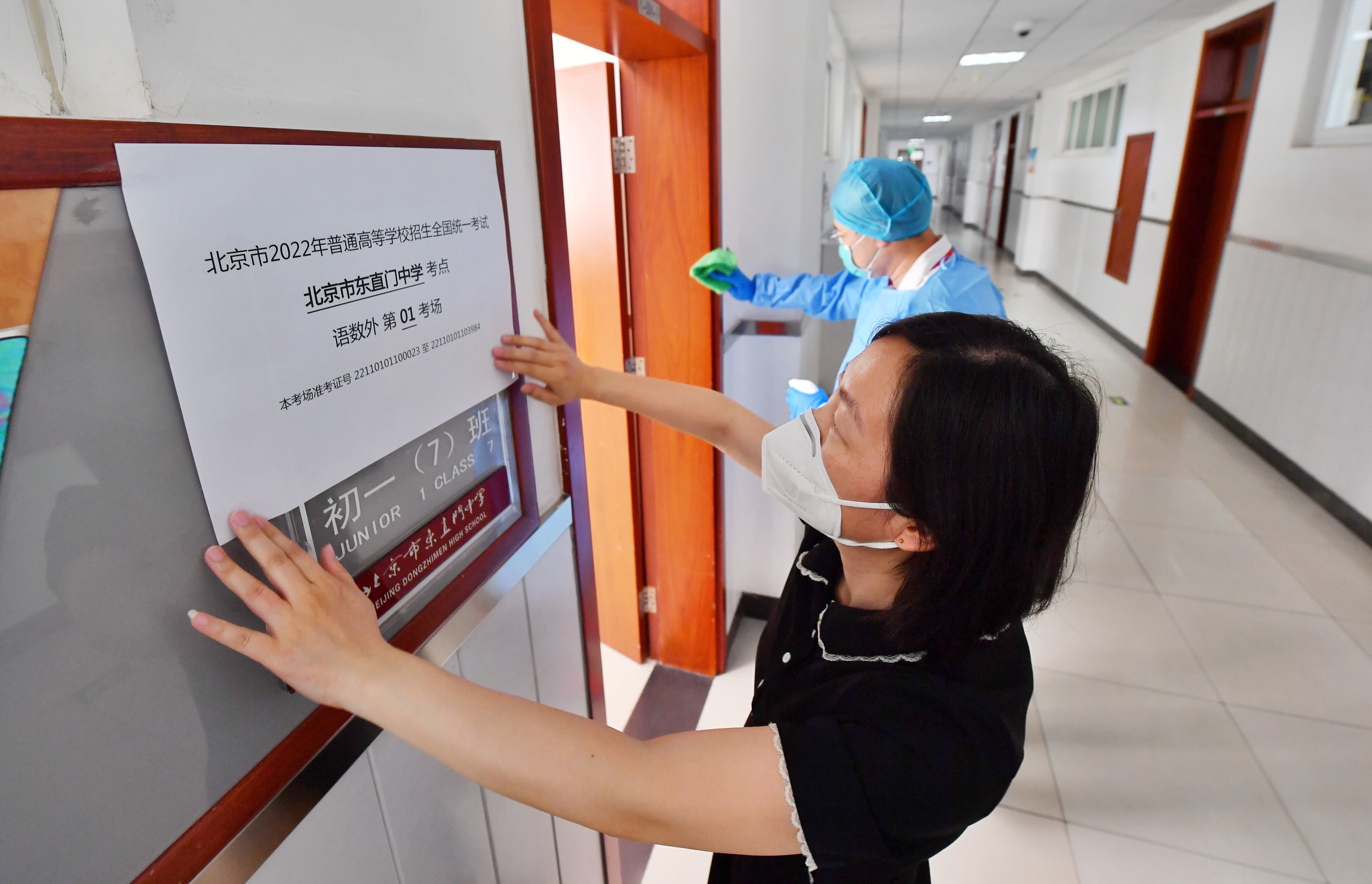 6月1日,东直门中学考点,老师布置考场。熊劲介绍,今年近150名考务人员随时待命,“考务老师都是精挑细选出来的,7点就会到达考场等待考生。”