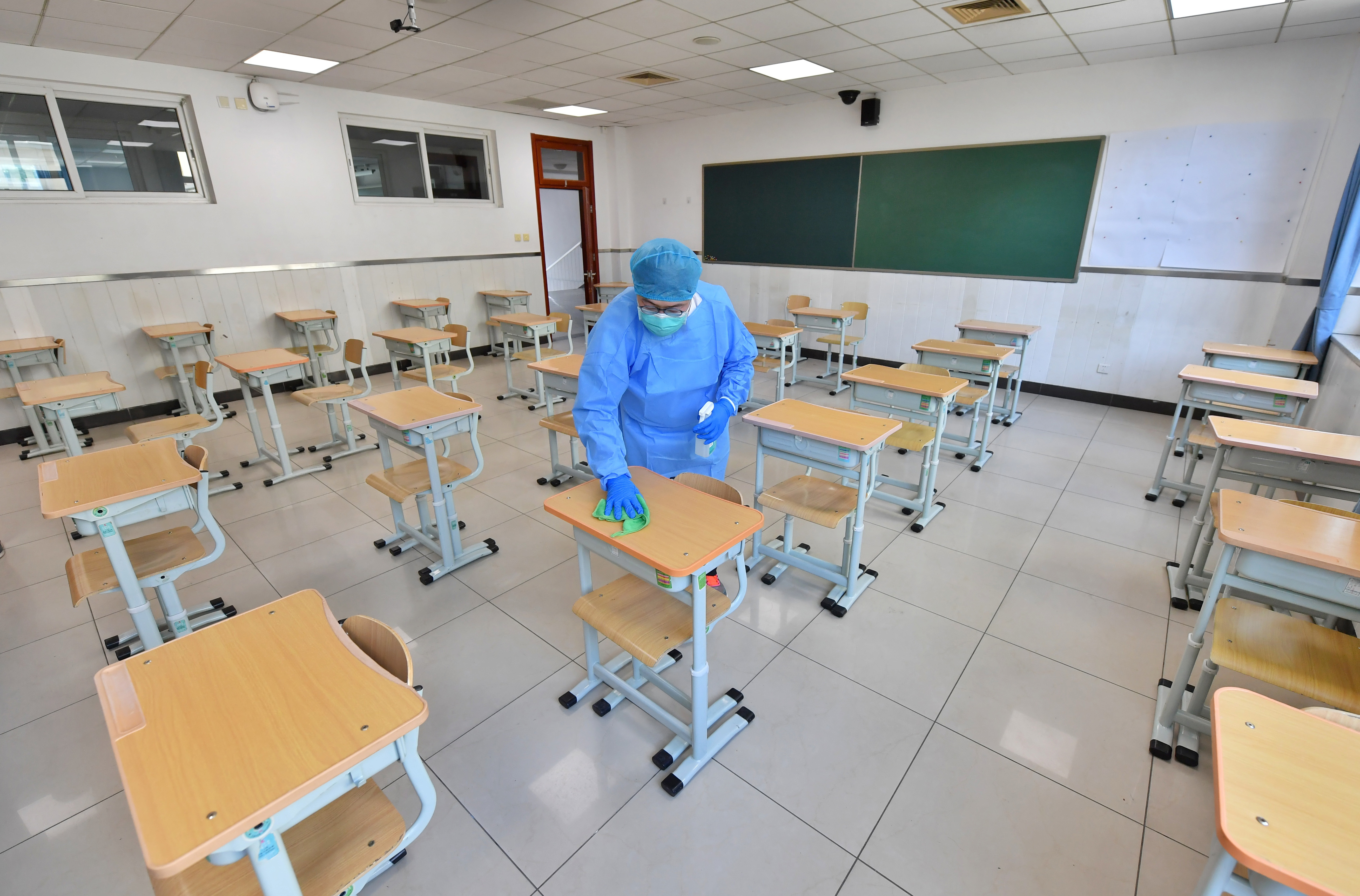 6月1日,东直门中学考点,身穿蓝色防护服的工作人员正在消毒桌椅。根据北京教育考试院发布的消息,今年语文科目考前40分钟,其他科目考前35分钟,考生持身份证和准考证可进入考场。每科目开考15分钟后,迟到考生不准进入考点。与去年相比,考生进入考场的时间提前了5分钟。