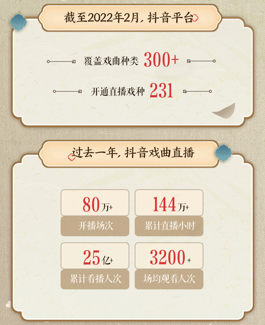 来自抖音的相关数据则显示,抖音平台生态覆盖戏曲种类超过300种,其中的231种已开通直播;过去一年,抖音戏曲直播开播场次超过80万,平均每场观看超过3200人次,累计看播人次超25亿。如果我们按照线下演出规模来比较,相当于每场抖音戏曲直播都是一场中型演出。