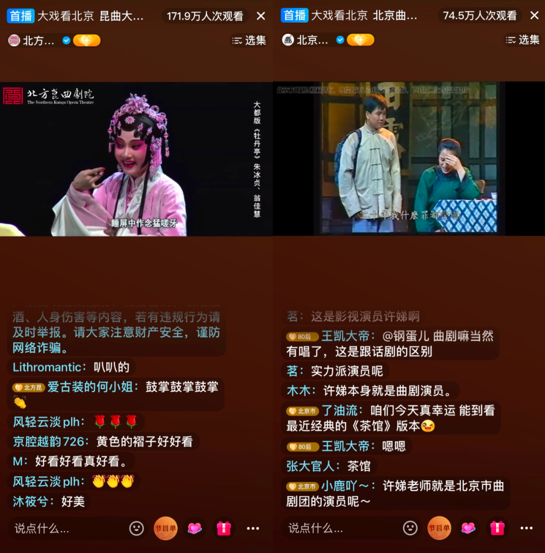 出于疫情防控需要,这个端午节,大多数北京市民选择了就地过节。虽然线下不扎堆、不聚集,但很多提供优质内容产品的线上平台却是人头攒动,比如说被不少市民关注的抖音“云赏戏曲过端午”活动。公开数据显示,端午三天小长假,由国家京剧院、北京京剧院、北方昆曲剧院、北京市曲剧团等带来的昆曲《牡丹亭》、曲剧《茶馆》等30个剧目展播,累计在抖音上吸引了4653万人次观看。