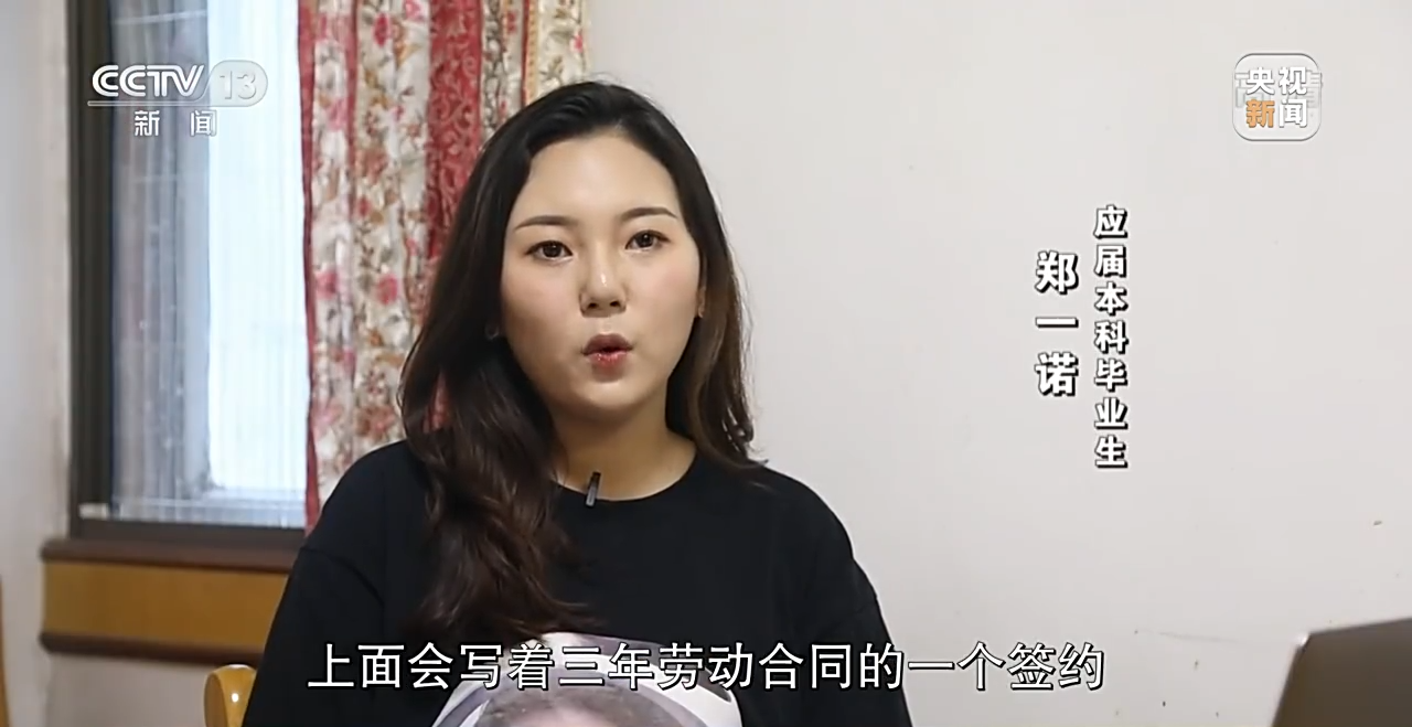 大四毕业生 郑一诺:它是一个正式的offer(录用通知),上面会写着三年劳动合同的签约,没有拿到毕业证之前是不允许交社保的,先以实习合同这样的形式先签着,没想到今年在5月10日合同到期的前两天,公司跟我讲说停止合约了,就已经被优化掉了。说大环境不好,要缩编,减少人员的开支。