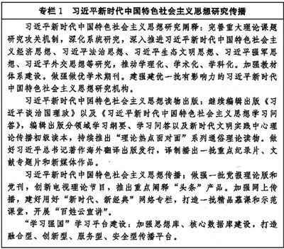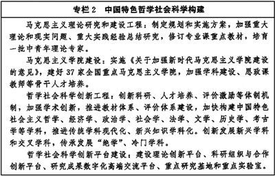 把习近平新时代中国特色社会主义思想贯穿哲学社会科学各领域各学科,加快构建中国特色哲学社会科学,推进学科体系、学术体系、话语体系建设和创新。加强顶层设计和统筹协调,制定中长期发展规划。加强学科基础理论建设,打造具有中国特色的理论学派。深化当代中国马克思主义政治经济学研究。坚持问题导向,围绕事关党和国家事业发展全局的战略问题,推出一批扎根中国大地、聚焦伟大实践、反映时代特征的原创性、标志性科研成果,推动重大学术成果国际化传播。培育高效整合国内外学术资源、引领学科创新发展的学术平台。充分发挥国家社会科学基金示范引导作用。深入推进中国特色新型智库建设。(见专栏2)(见专栏3)