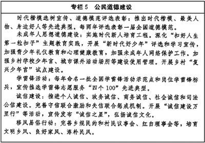 传承弘扬中华传统美德,加强社会公德、职业道德、家庭美德、个人品德建设,加强家庭、家教、家风建设。加强对革命、建设、改革时期各类先进典型的学习宣传,尊崇褒扬英雄模范,关心关爱先进典型人物。健全家庭、学校、政府、社会相结合的思想道德教育体系,把立德树人贯穿学校教育全过程。发挥优秀文化产品陶冶道德情操的作用,完善市民公约、乡规民约、学生守则、团体章程等社会规范,广泛开展弘扬时代新风行动,深化道德领域突出问题治理。加强农村思想道德建设,创新文化科技卫生“三下乡”长效机制。(见专栏5)