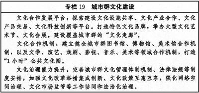 加强区域文化协同创新,健全合作互助、扶持补偿机制,推动东部地区以创新引领文化发展,加大力度支持中西部地区以及东北等老工业基地文化发展,扶持革命老区、民族地区、边疆地区文化发展,形成相互促进、优势互补、融合互动的区域文化发展格局。围绕京津冀协同发展、长江经济带发展、粤港澳大湾区建设、长三角一体化发展、黄河流域生态保护和高质量发展等区域重大战略,健全推进区域内文化协同发展机制,提升公共文化设施互联互通水平,加强区域文化产业带建设,实现区域文化建设水平整体提高。促进形成文化产业发展新格局,创新城市群文化一体化发展体制机制,共建高水平合作平台,加强公共文化服务便利共享。完善以城带乡、城乡融合的文化发展体制机制,发挥城市带动辐射作用,加快城乡间文化要素双向流动,形成以点带面、特色鲜明、优势互补、均衡配置的城乡文化发展新格局。(见专栏19)