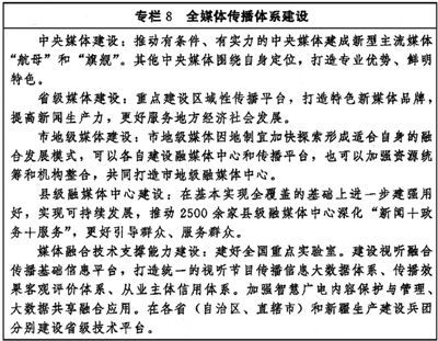 加快推进媒体深度融合发展,有效整合各种媒介资源、生产要素,推动在信息内容、技术应用、平台终端、管理手段等方面共融互通,打造一批具有强大影响力、竞争力的新型主流媒体。统筹处理好传统媒体和新兴媒体、中央媒体和地方媒体、主流媒体和商业平台、大众化媒体和专业性媒体的关系,建立以内容建设为根本、先进技术为支撑、创新管理为保障的全媒体传播体系。推进内容生产供给侧结构性改革,完善高质量内容产出机制,推广互动式、服务式、场景式传播。强化新一代信息技术支撑引领作用,支持主流媒体重塑采编流程、建设平台终端、优化管理手段、强化版权保护、打造媒体资源数据库、提升内容生产力、占据传播制高点。创新媒体业态、传播方式和运营模式,强化用户连接,发挥制度优势和市场作用,增强主流媒体竞争力。(见专栏8)