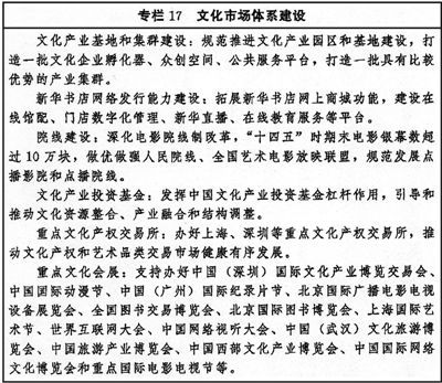 加快构建统一开放、高效规范、竞争有序的文化市场。健全文化市场体系基础制度,完善文化企业坚持正确导向履行社会责任制度。落实统一的市场准入负面清单制度,清理破除文化市场准入隐性壁垒。健全文化要素市场运行机制,促进劳动力、资本、技术、数据等合理流动。加快推进符合文化产业发展需求和文化企业特点的金融产品与服务创新。进一步扩大文化企业股权融资和债券融资规模,支持文化企业上市融资和再融资。探索文化金融服务中心模式,为文化企业提供综合性金融服务。全面促进文化消费,加快发展新型文化消费模式,发展夜间经济。加强文化市场信用体系建设,提升文化市场服务质量,强化文化市场管理和综合执法。(见专栏17)