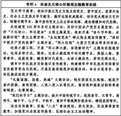 持续深化社会主义核心价值观宣传教育,增进认知认同、树立鲜明导向、强化示范带动。坚持贯穿结合融入、落细落小落实,把社会主义核心价值观要求融入日常生活,融入法治建设。推动理想信念教育常态化制度化,筑牢党员干部、青少年等重点群体的理想信念之基。围绕“七一”、“八一”、“十一”等重大时间节点,依托革命历史类纪念设施、遗址和爱国主义教育基地等载体,加强爱国主义、集体主义、社会主义教育,弘扬党和人民在各个历史时期奋斗中形成的伟大精神。加强公益广告宣传。统筹开展诚信教育、勤俭节约教育、劳动创造幸福主题宣传教育。强化祖国统一和民族团结进步宣传教育,深化“一国两制”实践教育,强化全民国防教育,促进平安中国建设。(见专栏4)