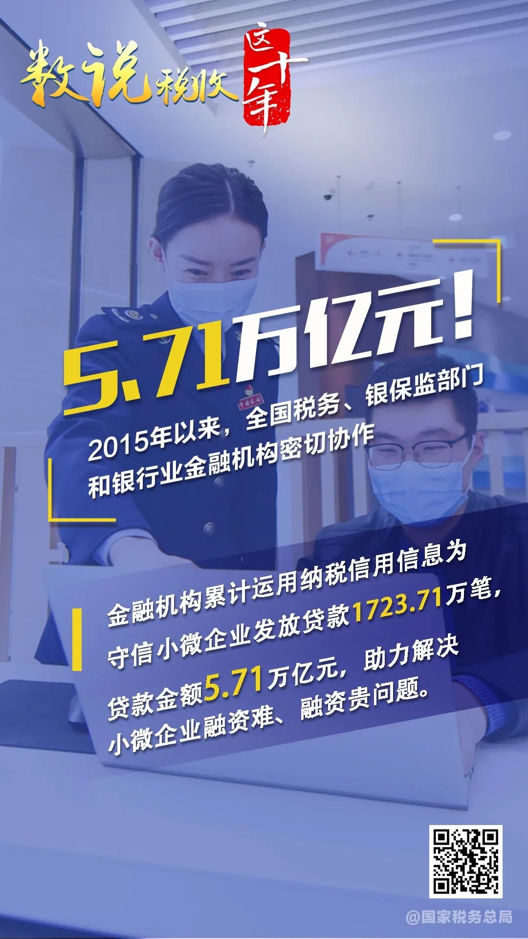 党的十八大以来,全国税务、银保监部门和银行业金融机构密切协作,不断完善合作机制、升级合作平台、创新融资方式。国家税务总局数据显示,2015年以来,金融机构累计运用纳税信用信息为守信小微企业发放贷款1723.71万笔,贷款金额5.71万亿元。