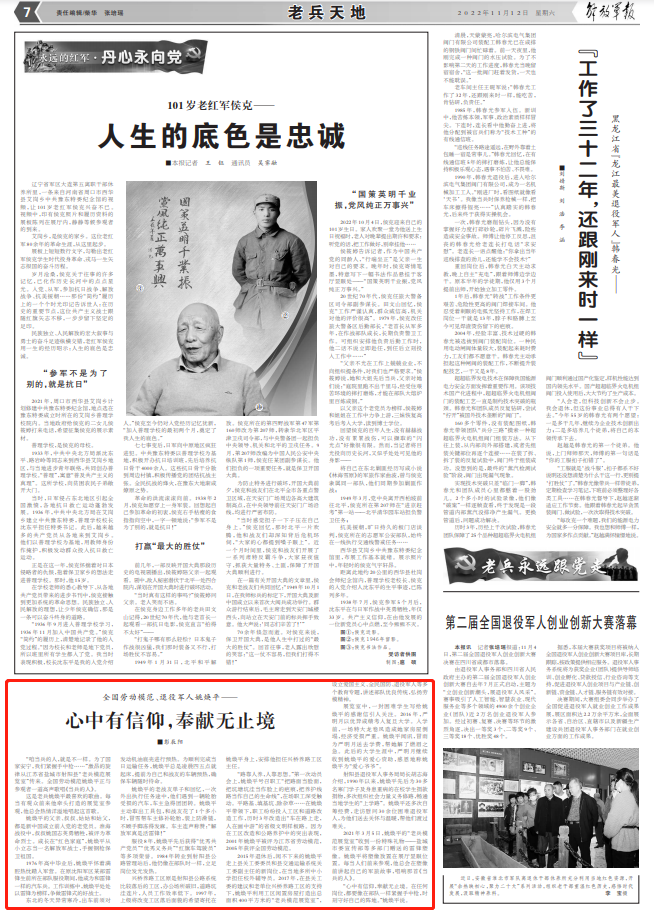 “心中有信仰,奉献无止境。在任何岗位,都要像在部队一样紧握手中枪,时刻守好自己的阵地。”姚焕平说。