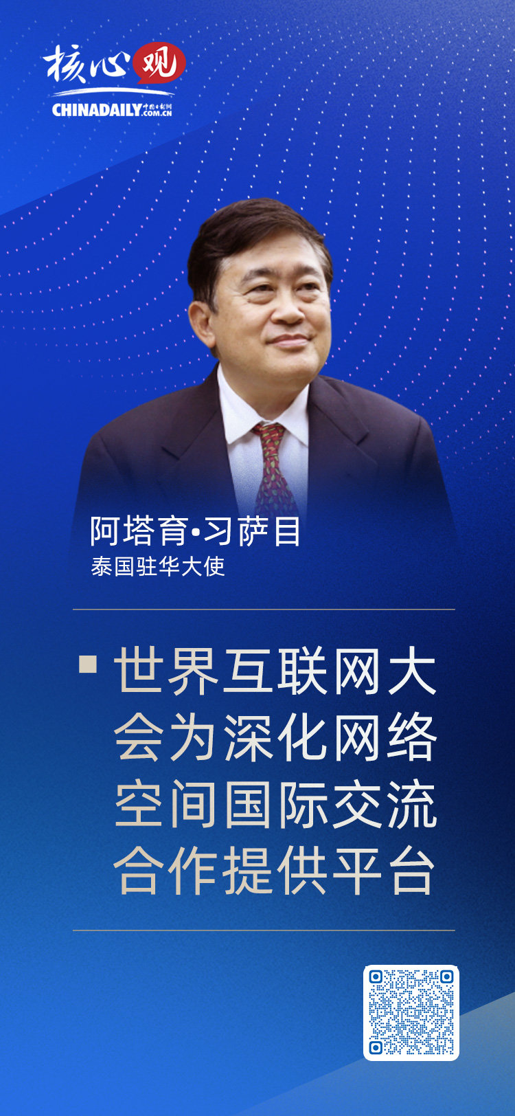 2022年世界互联网大会乌镇峰会11月9日在浙江乌镇开幕,国家主席习近平发来贺信,深刻阐述了数字化给人类社会带来的机遇和挑战,鲜明表达了中国愿与世界各国携手构建网络空间命运共同体的真诚愿望。泰国驻华大使阿塔育·习萨目在接受中国日报网记者采访时表示,习近平总书记致世界互联网大会的贺信意义重大。
