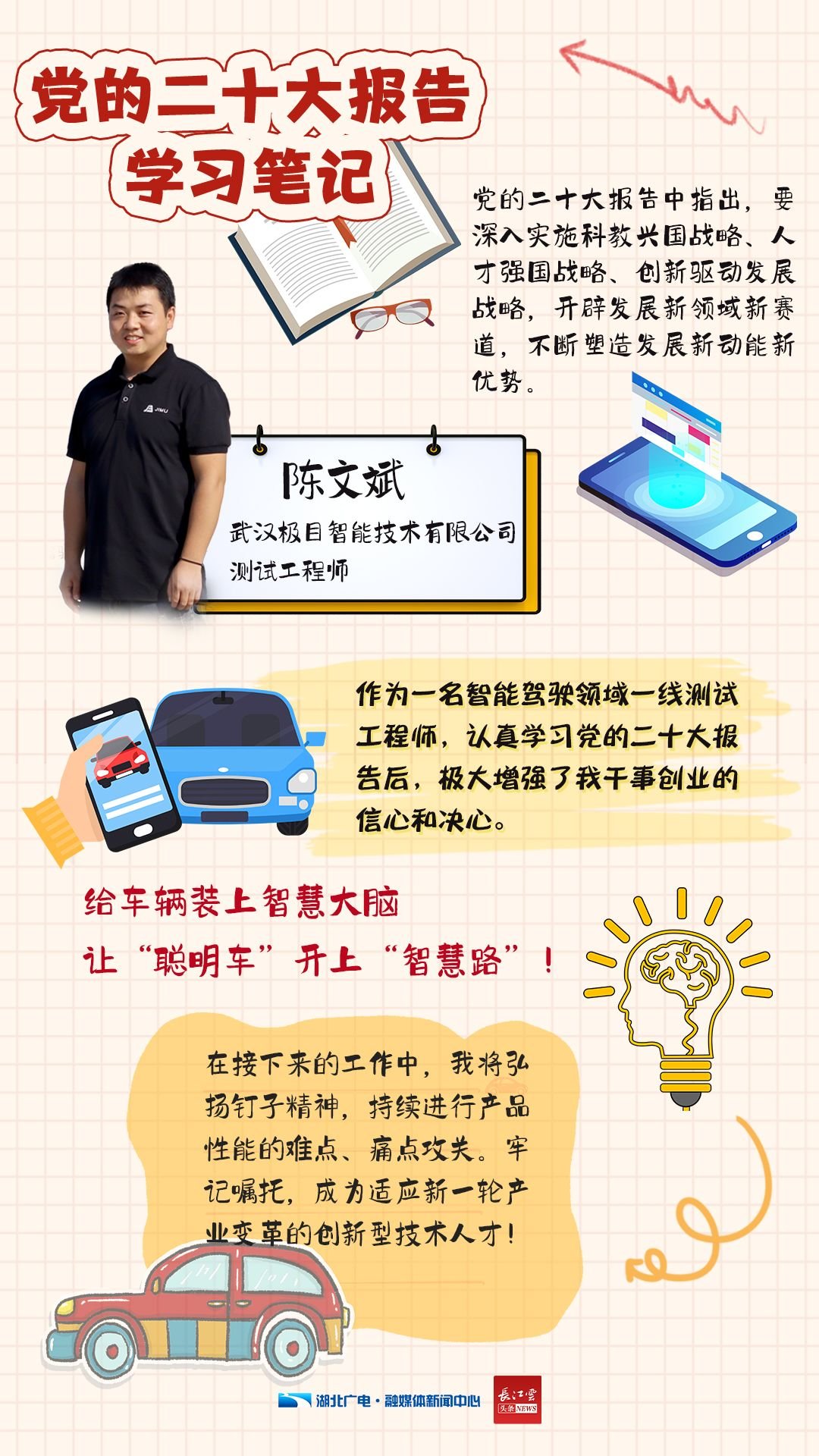 连日来,湖北各地掀起了学习二十大精神的热潮,各行各业的党员干部群众们,都在自己的笔记本上密密麻麻记下了不少重点。字字铿锵、句句振奋、段段入心。字里行间透着关切,既有产业工人对创新工作方式方法的领悟,还有科技工作者反复写下的“创新”“关键技术”等关键词……