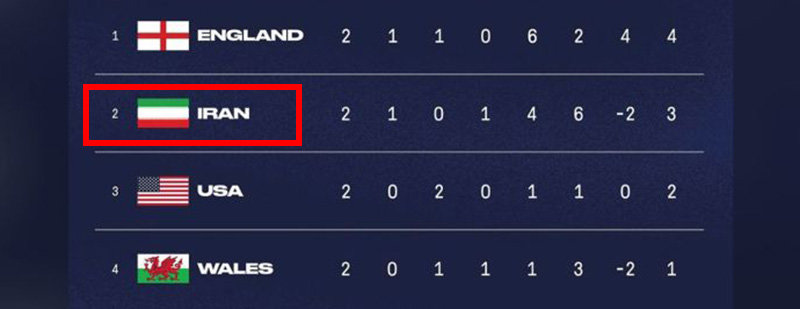 目前,B组英格兰积4分居榜首,伊朗、美国和威尔士分别以3分、2分和1分排列。伊朗和美国之战中获胜的队伍,将大概率晋级淘汰赛。