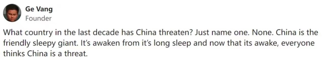 网友@Ge Vang 称,过去十年里中国有没有威胁过任何一个国家?一个都没有。中国是内敛且友善的大国。现在他们正在崛起,你们就说那是威胁。