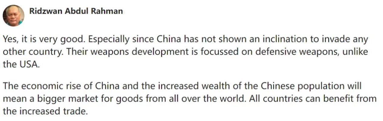 网友@Ridzwan Abdul Rahman 表示,是的,(中国的发展对世界和平)非常有益,尤其是因为中国没有侵略别国的意图。中国的武器都是处于防御目的研制的,这一点可不像美国。中国经济得到发展,中国人民也越来越富裕,这会形成一个更加广阔的国际市场,促进相关贸易,所有国家都可以从中获益。