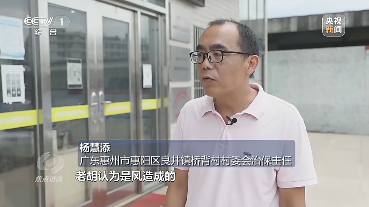 广东惠州市惠阳区良井镇桥背村村委会治保主任 杨慧添:老胡认为是风造成的,不是他本人造成的,老胡不肯赔偿村民杨运华稻田的损失,我们村委会一下子也不知道造成的损失该赔或者不该赔。