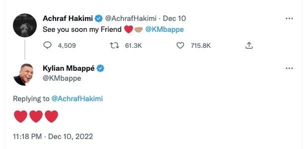 记者嘉里·布朗报道称,在法国总统马克龙离开法国队更衣室后,姆巴佩还来到球员通道与阿什拉夫席地而坐,聊了十多分钟。