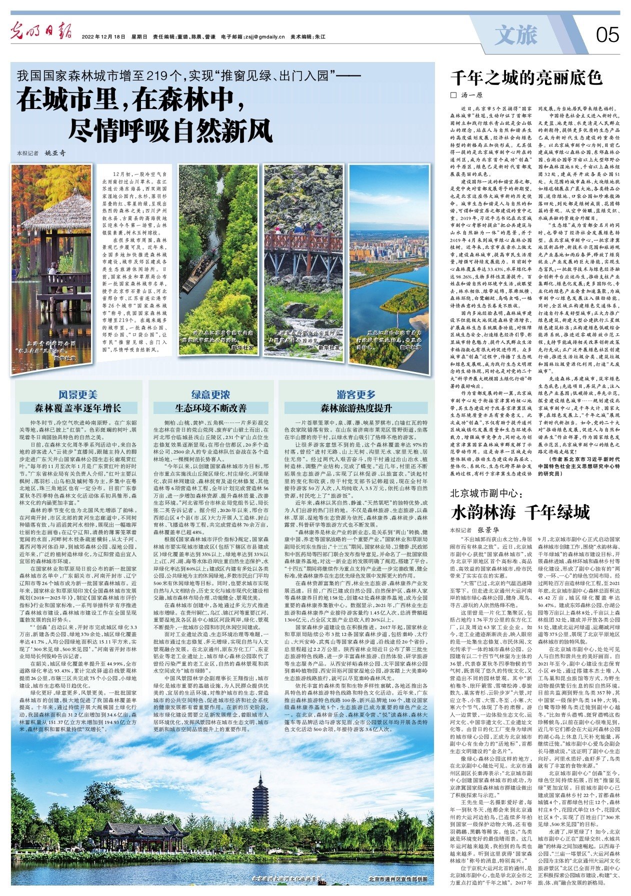 近日,北京市5个区摘得“国家森林城市”桂冠,生动印证了首都牢固树立和践行绿水青山就是金山银山的理念,站在人与自然和谐共生的高度谋划发展,经济社会向绿色转型的新格局正加快形成。尤其值得一提的是北京城市副中心所在的通州区,成为北京首个成功“创森”的平原区,绿色已是新时代首都发展最亮丽的底色。