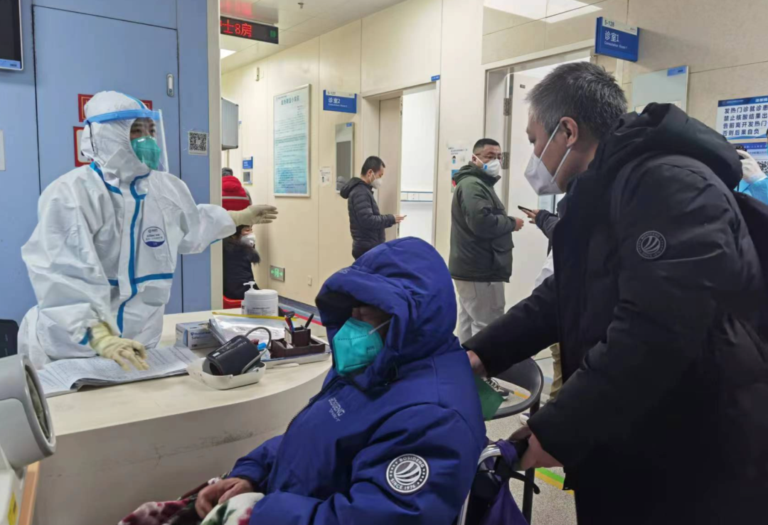 12月23日记者在发热门诊看到,医务人员身着防护服,佩戴N95口罩,面罩,就诊患者没有出现排队的情况,患者以中老年人为主,在分诊时病情严重的人员会被转到急诊进行治疗。天坛医院急诊科主任徐玢告诉记者: