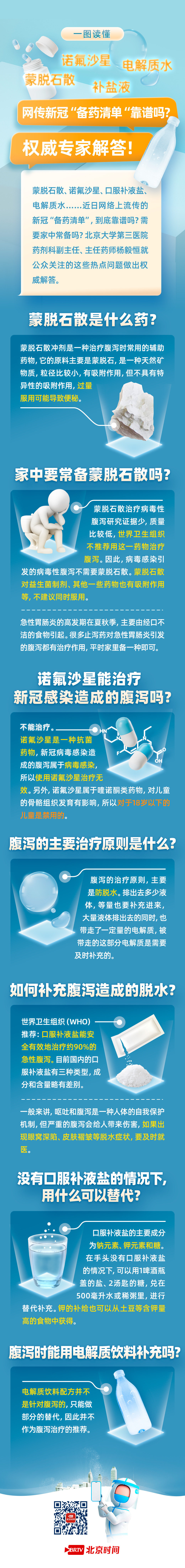近期,网传“新型毒株造成腹泻需准备蒙脱石散”等信息引起了不少网民担忧,甚至有的去囤购药品。诺氟沙星、口服补液盐、电解质水……都被列为新冠“备药清单”,这些药到底有用吗?需要家中常备吗?北医三院药剂科副主任、主任药师杨毅恒表示,蒙脱石散治疗病毒性腹泻研究证据少,质量比较低,病毒感染引发的病毒性腹泻不需要蒙脱石散,而且蒙脱石散对益生菌制剂、其他一些药物也有吸附作用等,不建议同时服用。更多权威解答,戳图速览→