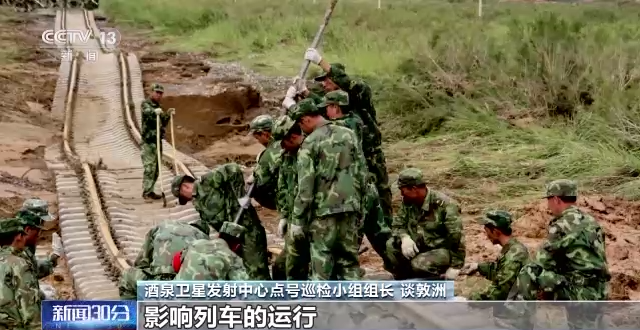 酒泉卫星发射中心点号巡检小组组长 谈敦洲:当时有一段铁路,因为大雨把铁路冲垮了,冲垮之后基本上铁路就悬浮在半空,影响列车的运行,所以我们进行了及时的抢修,出动了100多人,抢修了三天左右,把铁路维修好了。