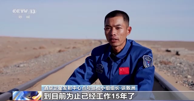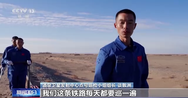 酒泉卫星发射中心点号巡检小组组长 谈敦洲:现在的工作是看一下线路上面有没有风沙埋到的地方,还有线路的几何尺寸有没有出现误差,如果出现误差,我们还要进行维修。这条铁路每天都要巡一遍,一共是5公里,在我们心中是一条通往航天的梦想之路。