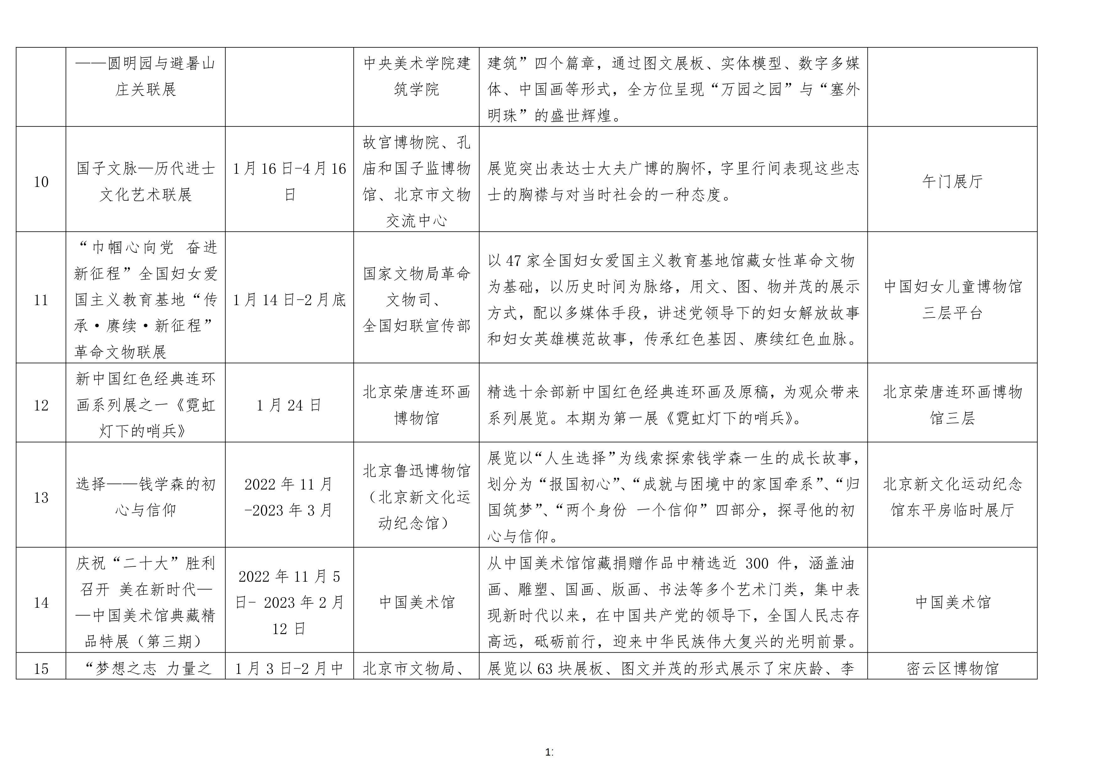 中国园林博物馆推出“瑞兔启新岁,园林意趣浓”春节系列文化活动,依托馆内展陈、园林文化、节日习俗等文化内涵带领公众参与观赏互动;中国美术馆举办庆祝“二十大”胜利召开 美在新时代——中国美术馆典藏精品特展(第三期),从中国美术馆馆藏捐赠作品中精选近 300 件,涵盖油画、雕塑、国画、版画、书法等多个艺术门类;首届北京艺术双年展在国家对外文化贸易基地、木木美术馆、友谊艺术社区等多个场馆开展,以共生为主题,呈现来自20个国家和地区240位艺术家390多件作品。