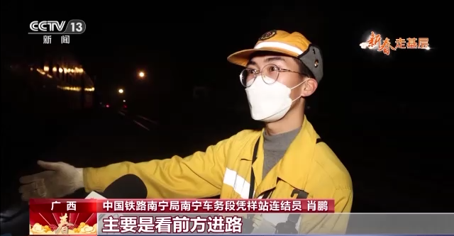 中国铁路南宁局南宁车务段凭祥站连结员 肖鹏:主要是看前方进路有没有闲杂人员,有没有异物。然后看信号,看道岔开启位是否正确。