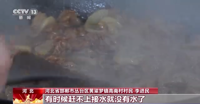 河北省邯郸市丛台区黄粱梦镇高南村村民 李进民:以前村里用的是井水,供水时间短,有时候赶不上接水就没有水了。我们村接上了南水北调的自来水,水挺甜,我们喝着长江水高高兴兴过大年。