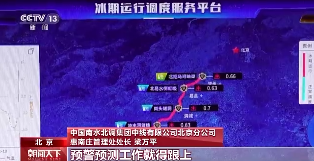 中国南水北调集团中线有限公司北京分公司 惠南庄管理处处长 梁万平:如果低于1℃,预警预测工作就得跟上,非常有可能结冰。现在主要是调度措施,水位要高一些,流速要低一些,就能保证水温和气温都降下来的时候,尽快形成冰盖,水在冰盖下面可以正常流动。